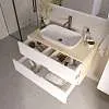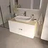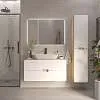 Подвесная тумба под накладную раковину – современное минималистичное решение для ванной. Плавные скругленные края, белый фасад с древесным корпусом символизируют гармонию, создают ощущение легкости и безопасности. Это особенно актуально в ванной комнате, где важно чувствовать себя комфортно и расслабленно.Характеристики: