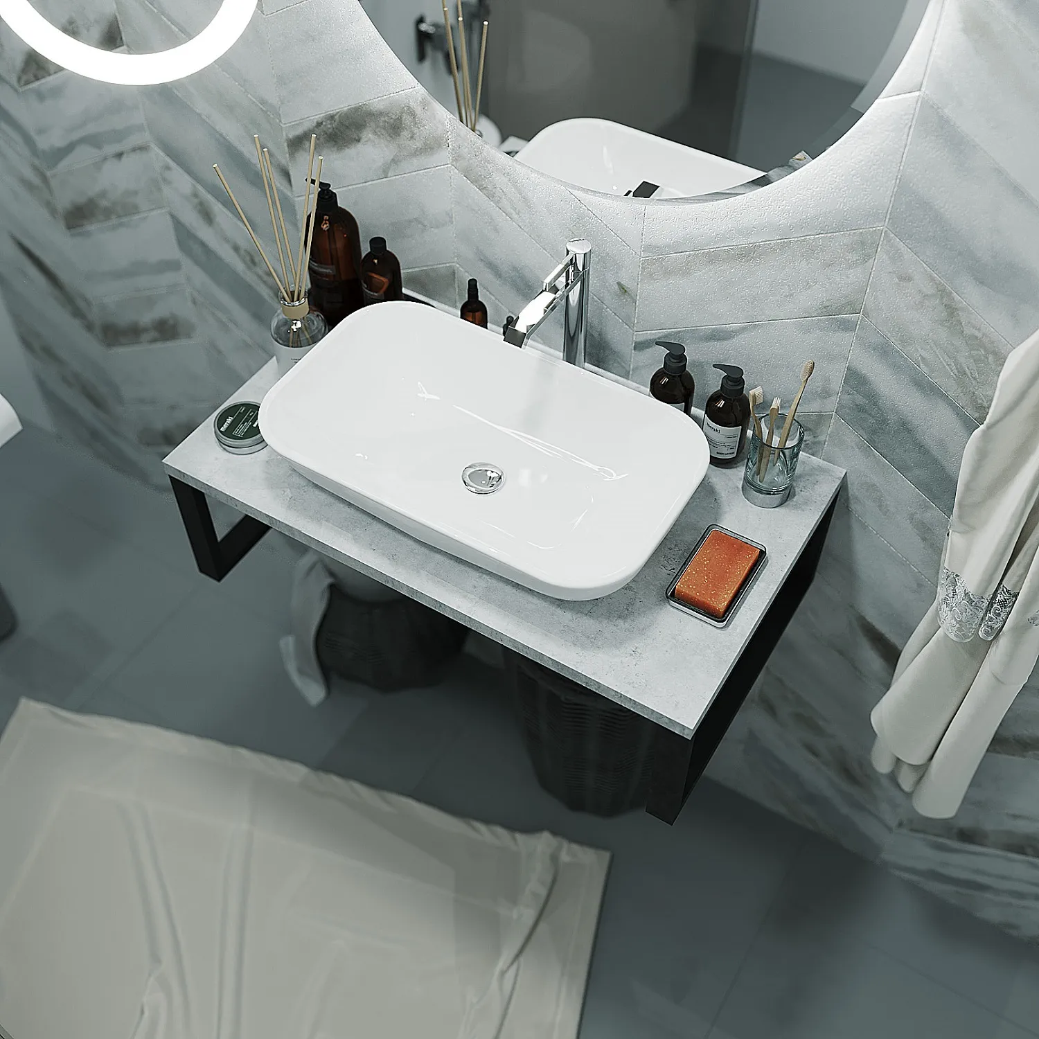 Функциональная и стильная столешница в востребованной и актуальной стилистике LOFT. Минималистичная и одновременно эффектная, она изготовлена в универсальной прямоугольной форме и дополнена такими практичными деталями, как металлические кронштейны, которые можно использовать в качестве рейлингов. Столешница выполнена из проверенных материалов, прекрасно защищена от воздействия влаги, не склонна к появлению сколов, царапин, трещин и других дефектов. Она подойдет для ванных комнат любых размеров и практически любой цветовой гаммы - от сдержанной до яркой и насыщенной.