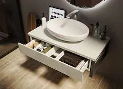 Изящная и лаконичная тумба, буквально парящая в воздухе. Она превосходно подойдет для функционального дополнения небольших пространств, а также для тех, кто отдает предпочтение легким, негромоздким и при этом стильным предметам мебели для ванной комнаты. Белый глянцевый фасад эффектно дополнен столешницей из белого стекла, которая, тем не менее, не нуждается в трудоемком уходе и надолго сохраняет свой привлекательный и эстетичный внешний вид. Дизайн тумбы воплощает современный и практичный подход к функциональности мебели и удобству ее ежедневного использования.