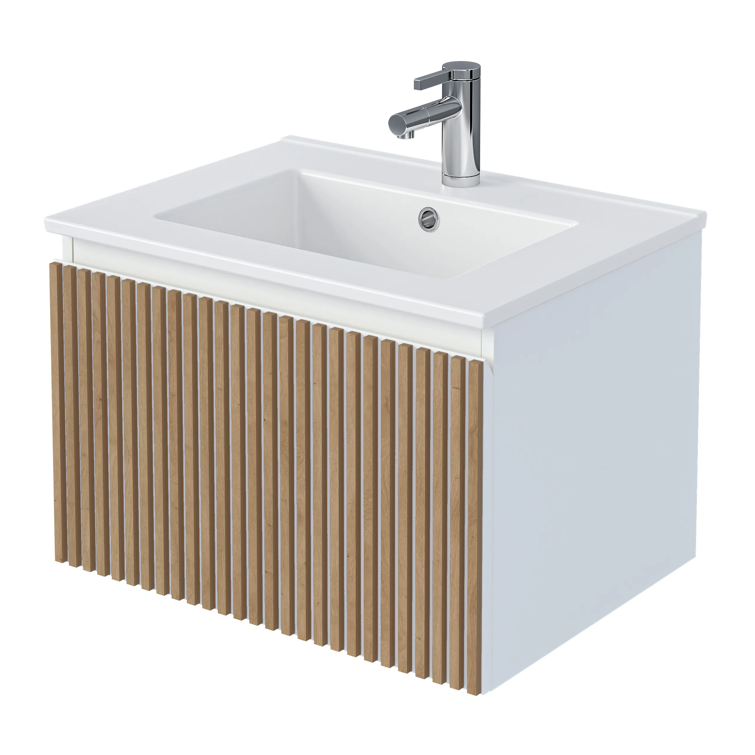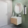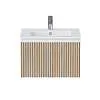 Тумба под раковину* Row - утонченная роскошь в  ванной комнате. Белоснежный корпус и фасад из МДФ, покрытые матовой итальянской эмалью, создают благородный и элегантный вид. Декоративные рейки из шпона на фасаде добавляют уникальную текстуру и глубину, делая тумбу арт-объектом. Один вместительный ящик с плавными доводчиками гарантирует комфортное использование, хранение необходимых ванных принадлежностей, а подвесная конструкция визуально расширяет пространство и облегчает уборку.